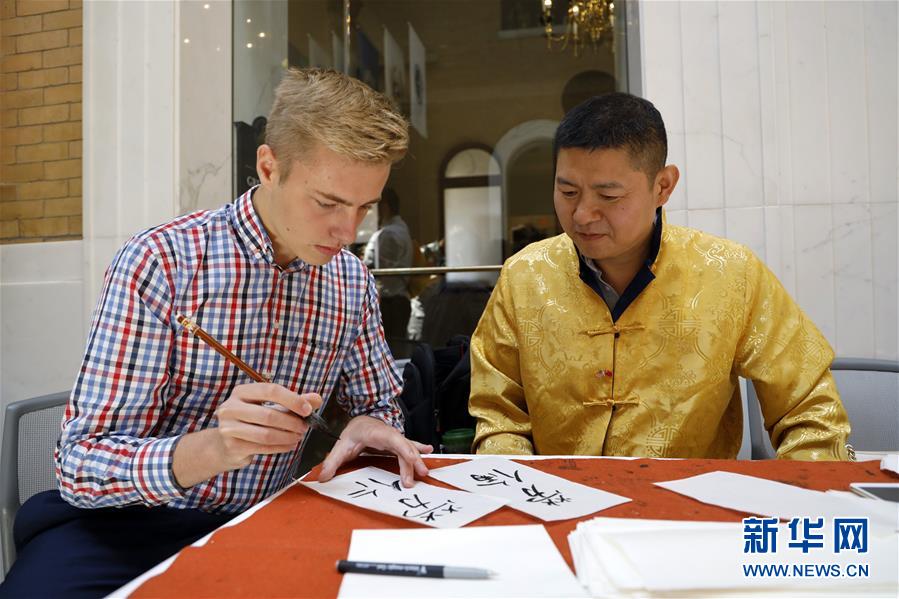 8月15日,在美国马萨诸塞州波士顿,观众在“中国日”活动上学习中国书法。 中国驻纽约总领馆与美国马萨诸塞州议会亚太组联合主办的“中国日”活动15日在该州议会大楼举行,300多名中美嘉宾出席活动,共同表达对中美关系以及中国与马萨诸塞州继续合作的坚定支持。 新华社记者 李木子 摄