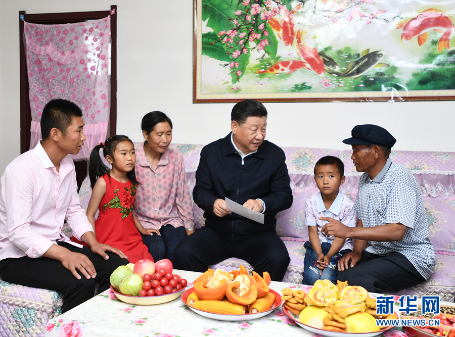8月21日上午,正在甘肃考察的中共中央总书记、国家主席、中央军委主席习近平来到古浪县黄花滩生态移民区富民新村,看望从山区生态移民易地扶贫搬迁的乡亲们。他走进村民李应川家,同一家人亲切交谈。 新华社记者 谢环驰 摄