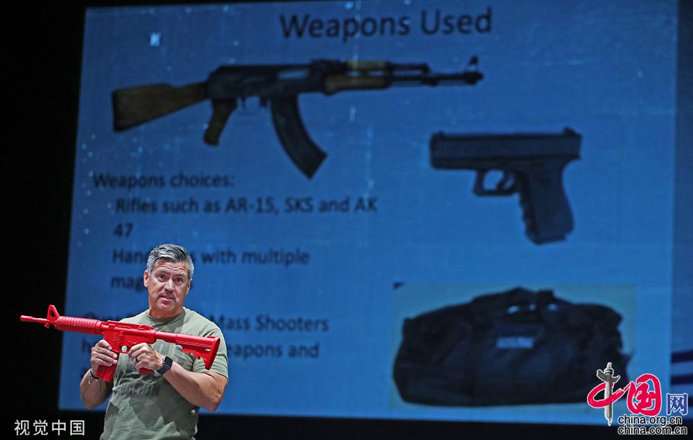 当地时间2019年9月4日,美国犹他州,当地一学校的教师在开学前夕学习如何解除枪手的武器并进行反击。George Frey/视觉中国
