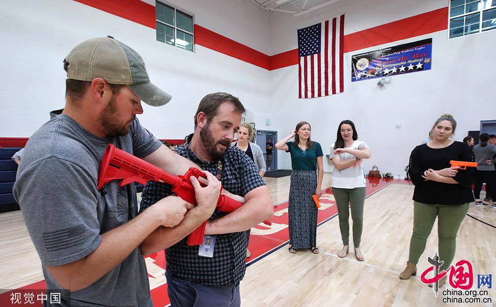 当地时间2019年9月4日,美国犹他州,当地一学校的教师在开学前夕学习如何解除枪手的武器并进行反击。George Frey/视觉中国