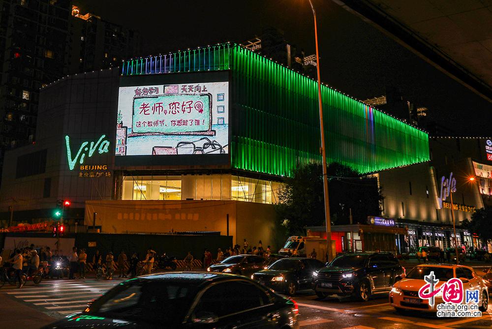 9月10日,北京富力广场大屏幕滚动播放主题为《这个教师节,你想起了谁》的教师致敬宣传片。中国网记者 郑亮摄
