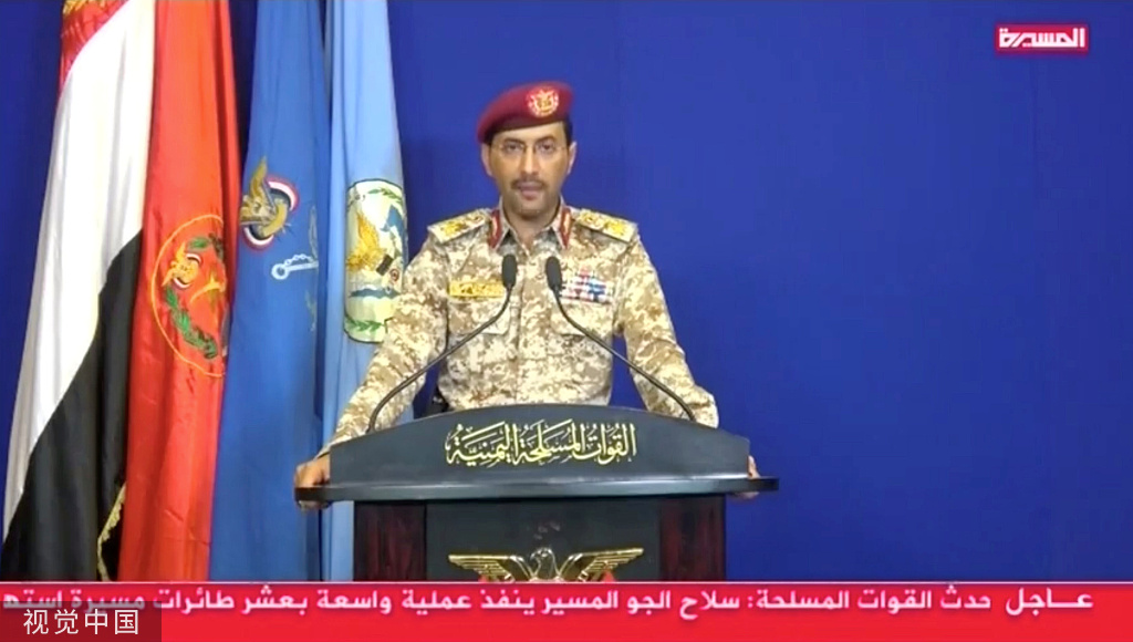(视频截图)当地时间2019年9月14日,也门萨那,胡塞军方发言人Yahya Sarea宣布该组织对袭击沙特东部城市布盖克的沙特阿美(Aramco)设施负责。图片作者:AL MASIRA TV