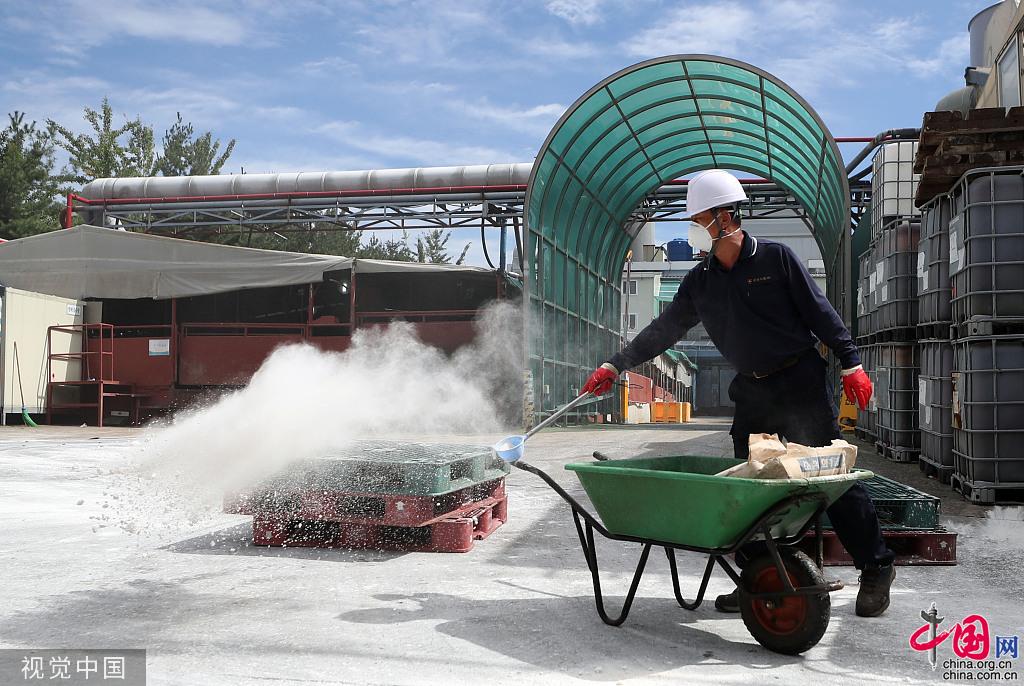 当地时间2019年9月17日,韩国仁川,当地对猪圈进行消毒。图片作者:Yonhap News Agency/视觉中国