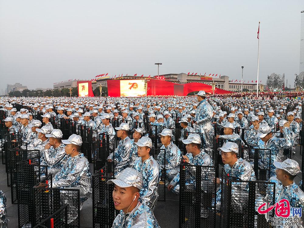 10月1日晚,为隆重庆祝中华人民共和国成立70周年,将在北京天安门广场隆重举行国庆联欢活动。这是演员准备。高岸明 摄影