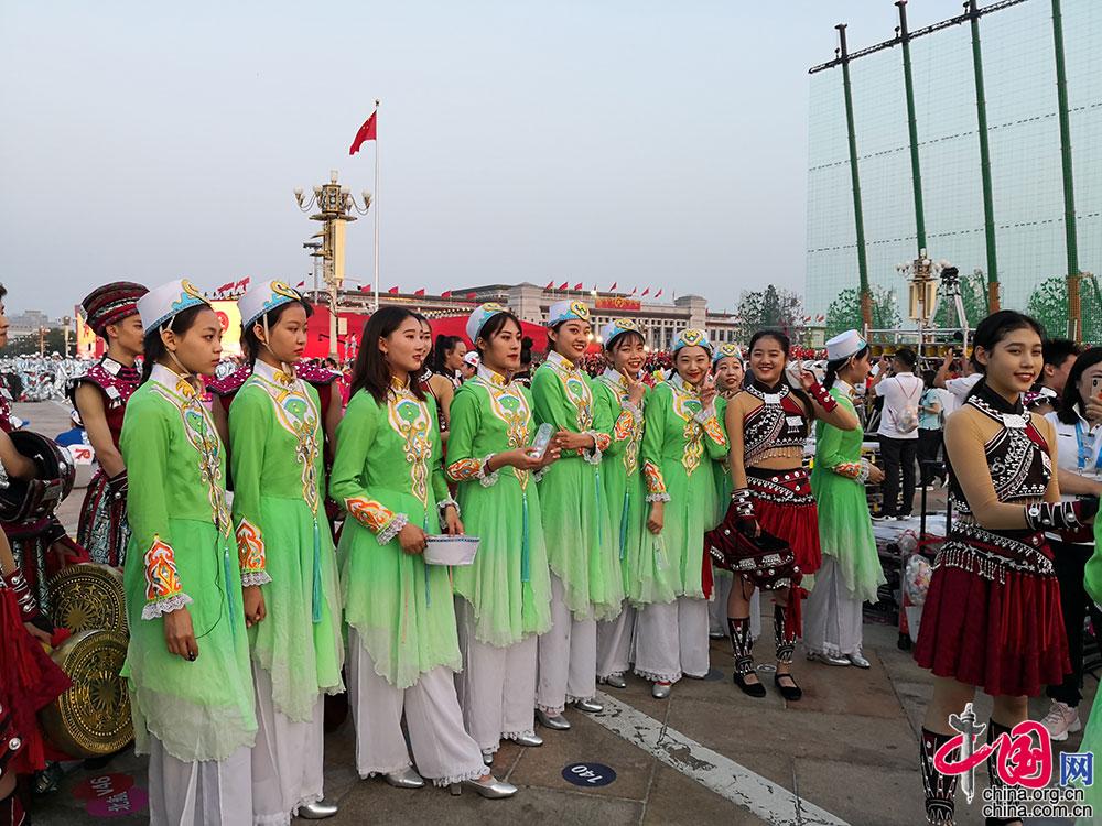 10月1日晚,为隆重庆祝中华人民共和国成立70周年,北京天安门广场将举行大型联欢活动。这是演员合影留念。高岸明 摄影
