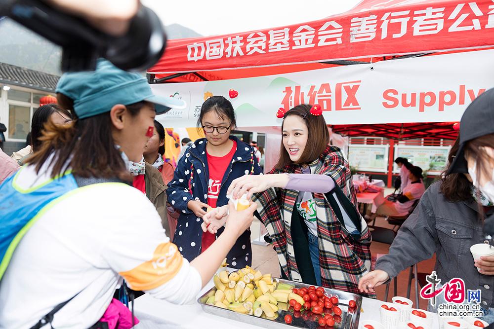 2019善行者年度公益大 使 、 演员陈乔恩在补给点为善行者送上补给食物。中国扶贫基金会供图