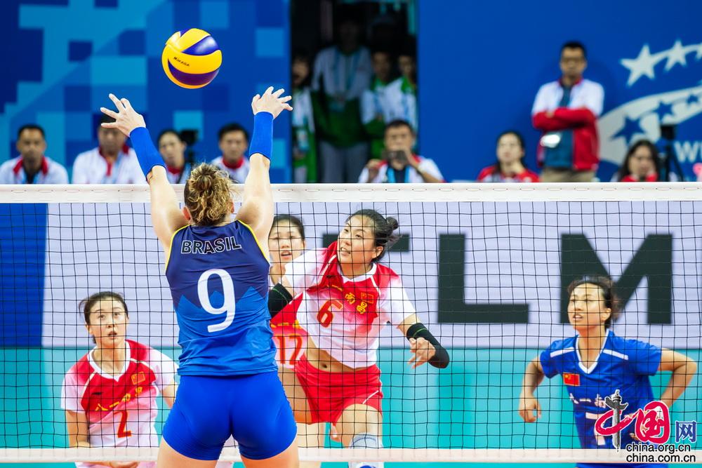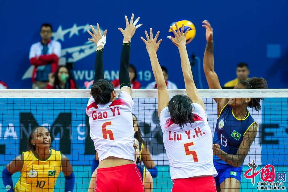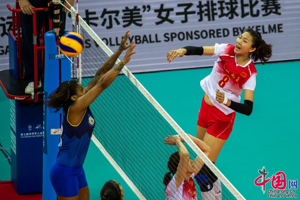 10月17日,在2019年第七届世界军人运动会女排比赛次日争夺中,中国八一女排直落三局战胜卫冕冠军巴西队。中国网记者 郑亮摄