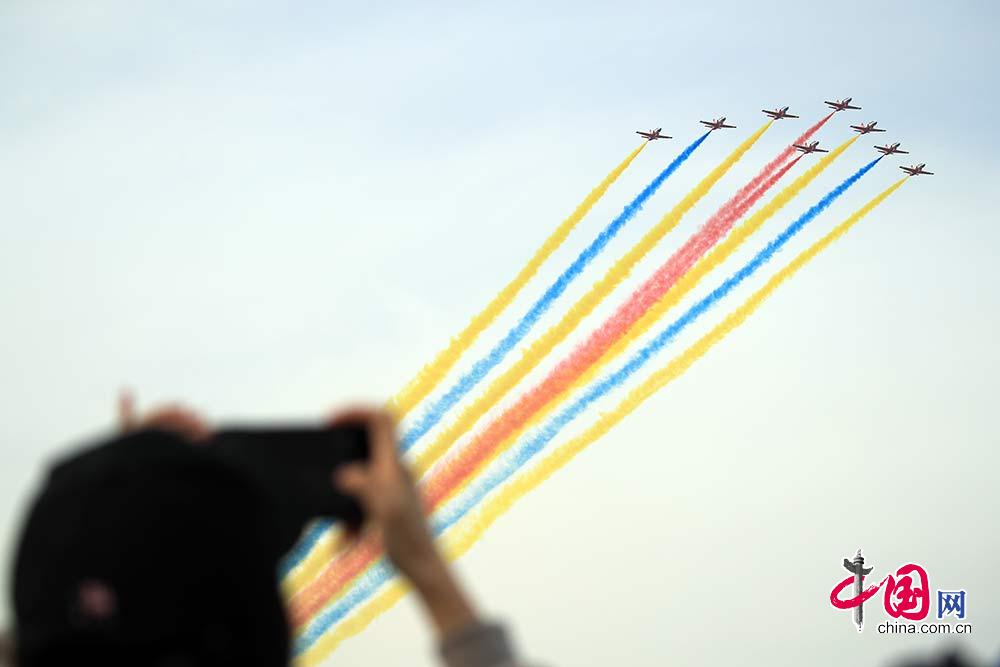 红鹰飞行表演队8机拉烟通场。大编队拉烟表演特别适合观众欣赏和拍照。 中国网 杨佳摄影