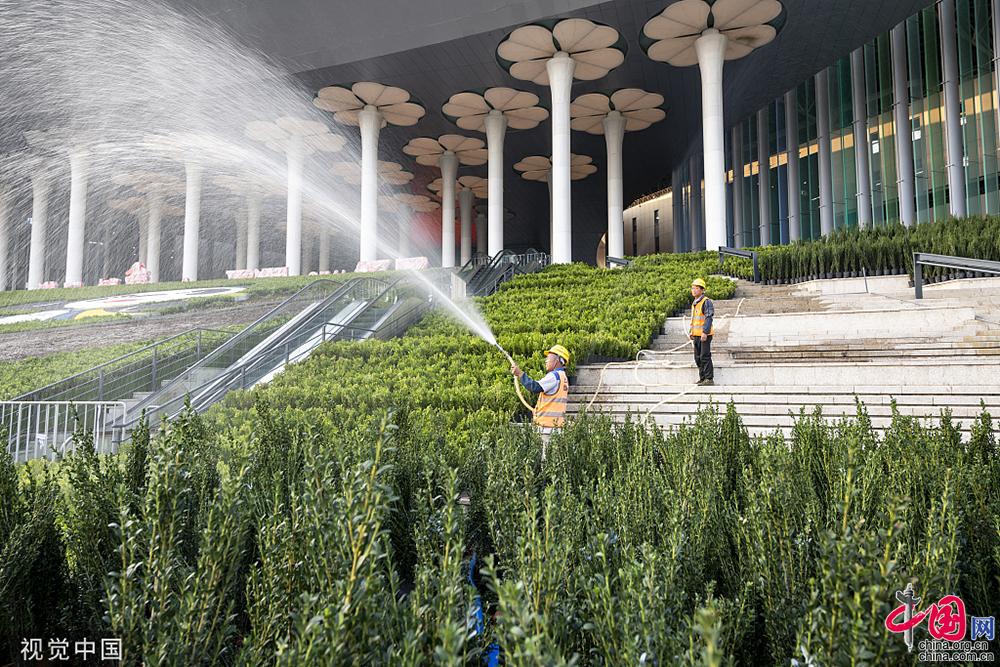 2019年10月20日,第二届中国国际进口博览会召开在即,前期组织和筹备工作紧张有序进行中。图为进博会主场馆上海国家会展中心广场上绿化工人在移栽景观草地和花卉。视觉中国
