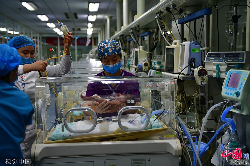 4日下午,北京,双胞胎分别被医护人员从医疗转运仓内转移到专用暖箱内,等待接受治疗。付丁/视觉中国