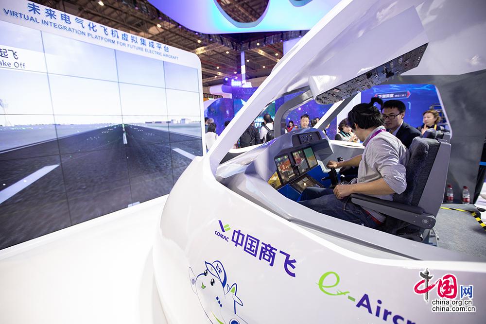 11月8日,观众在第二届中国国际进口博览会国家展展区内的中国馆模拟驾驶中国商飞大型客机。中国网记者 伦晓璇摄