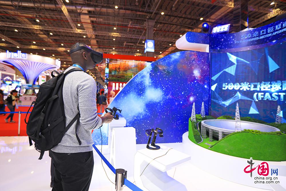 11月6日,观众在第二届中国国际进口博览会国家展展区内的中国馆用VR设备感受中国天眼。中国网记者 伦晓璇摄