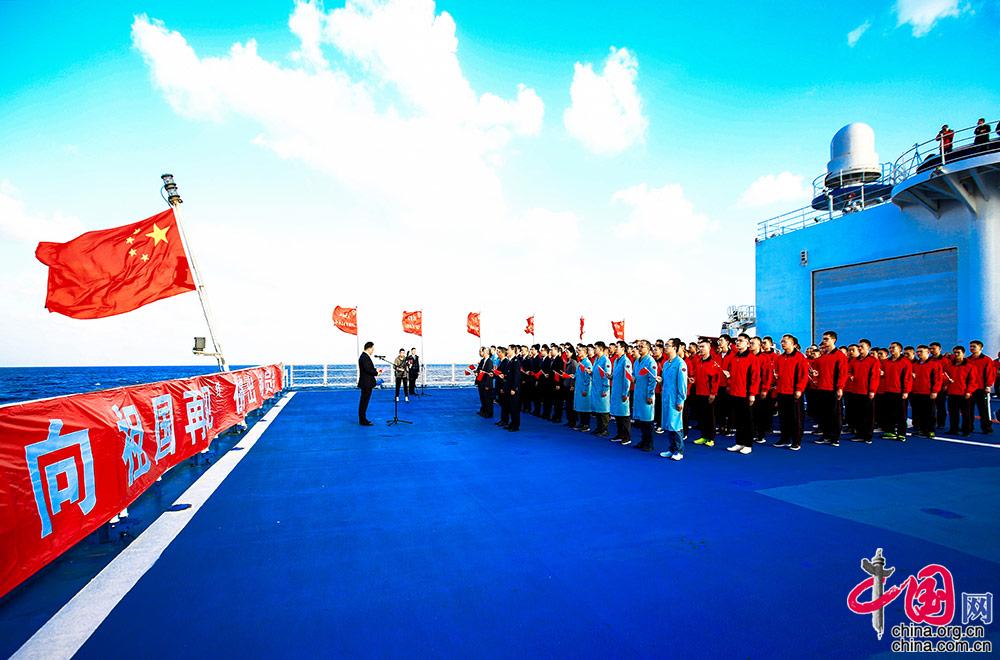 中国网讯 (通讯员 黄杰 张恒 韩帅) 11月12日,正奔赴某海域的中国卫星海上测控部远望7号船,在驶离中国领海线之际举行“向祖国再见”仪式。