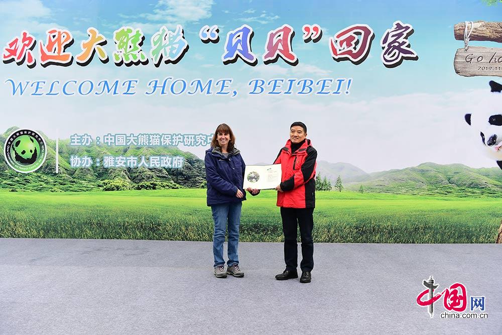 中国网讯 11月21日,大熊猫“贝贝”回国欢迎仪式在中国大熊猫保护研究中心雅安碧峰峡基地举行。在简单温馨的欢迎仪式上,熊猫中心副主任张海清,美国驻成都总领事馆经济处领事Richard Fitzmaurice,美国史密桑宁国家动物园首席兽医Don Neiffer出席活动并发表致辞。熊猫中心副主任张海清向美国史密桑宁国家动物园大熊猫馆助理馆长Laurie Thompson赠送礼物,感谢他们长期以来对大熊猫“贝贝”及其父母的精心照顾,随后,Laurie Thompson把“贝贝”的档案牌移交给熊猫中心。活动结束后,领导及嘉宾移步隔离检疫区,看望住在新家的“贝贝”。