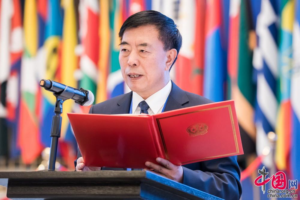 中华人民共和国二级大法官、最高人民法院副院长杨万明宣读《乌镇宣言》。中国网记者 郑亮摄