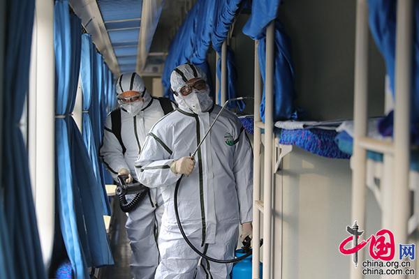 一趟趟,一次次,一整天下来,浑身上下腰酸腿疼,喉咙沙哑,但他们依然坚守在岗位上,将消毒工作落实到位,确保列车卫生安全。他们笑着说:“疫情来了,我们就是坚强防线……”。(通讯员:樊康屹)