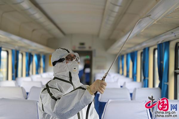 宿营车、卧铺、硬座车,一节车厢一节车厢的走,窗户、行李架、桌子、地面、乘务室、厕所……每个角落都认真喷洒药液,确保无死角消毒。