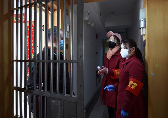 东西湖区长青街三民社区民警和社区人员一道上门进行体温测量 通讯员 余爽摄