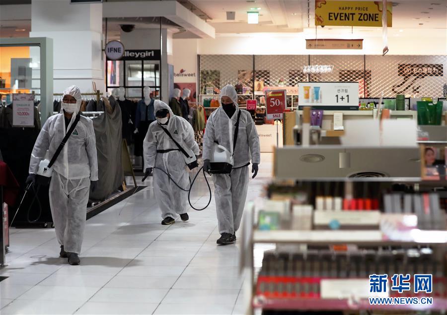 3月2日,在韩国首尔,某百货商店的工作人员进行防疫消毒。新华社/纽西斯通讯社