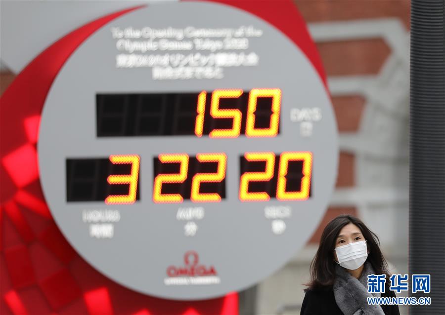2月25日,在日本东京,行人戴口罩经过显示东京奥运会倒计时的电子屏。新华社记者杜潇逸摄