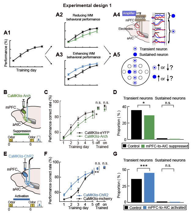 研究人员发现通过光遗传的手段抑制无颗粒岛叶皮层(agranular insular cortex,aAIC)在延迟期的电活动可以显著地下调小鼠在学习期执行工作记忆任务的行为表现水平。结合三组对照实验,他们证实了aAIC脑区主要参与工作记忆的短期信息存储过程,而不是编码感觉信息,动机水平,或运动控制等。更进一步,研究人员发现抑制从内侧前额叶皮层(medial prefrontal cortex, mPFC)到aAIC的投射(图2B)也可以有效地下调小鼠的行为表现水平(图2C),以及瞬时性神经元的比例,但并没有看到持续性神经元的比例发生一致的变化(图2D)。相反,激活从mPFC到aAIC的投射(图2E)可以显著地上调行为水平(图2F)和瞬时性神经元的比例(图2G)。这个结果提示,瞬时性神经元,而非持续性神经元,与小鼠执行工作记忆的行为表现水平有更紧密的关联,即瞬时性编码的神经机制更有可能负责在工作记忆中存储信息。