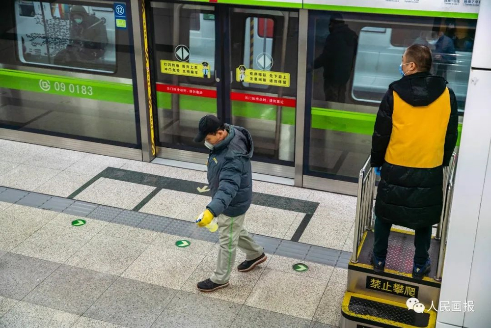地铁9号线早高峰时段,一名清洁工正在对公共区域进行消毒(左一)。