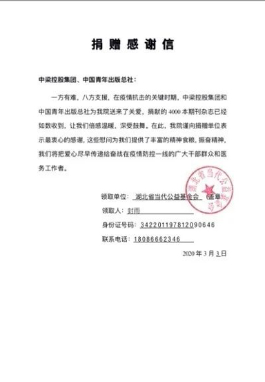 3月3日,中国青年出版总社与中梁控股集团捐赠的第一批期刊发往武汉