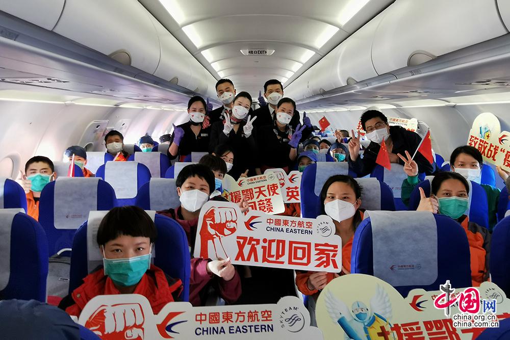 3月19日,东航又派出6架飞机赴武汉,迎接山西、青海、江苏、江西等4省的共845名医疗队员返回家乡。东航供图