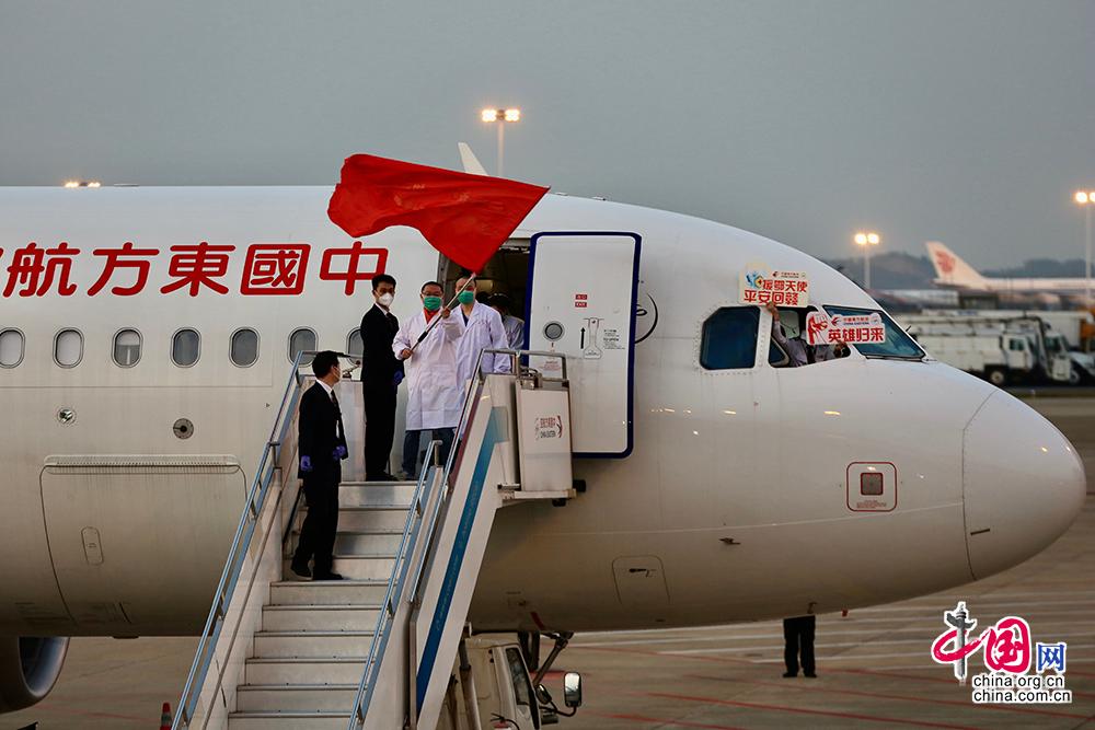 白衣天使们迈着整齐的步伐列队下机。工作人员列队欢迎并向医护人员致敬。东航供图