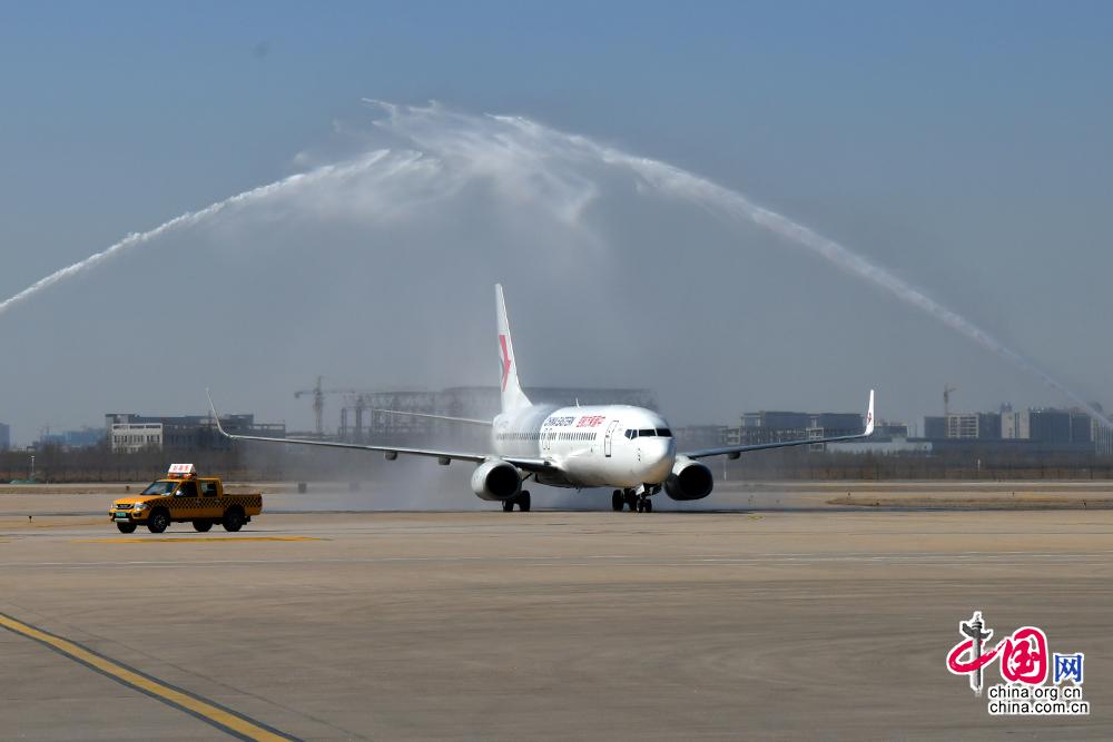 飞机缓缓滑进南昌昌北机场停机位,机场以“过水门”仪式,为最美逆行者“接风洗尘”。东航供图
