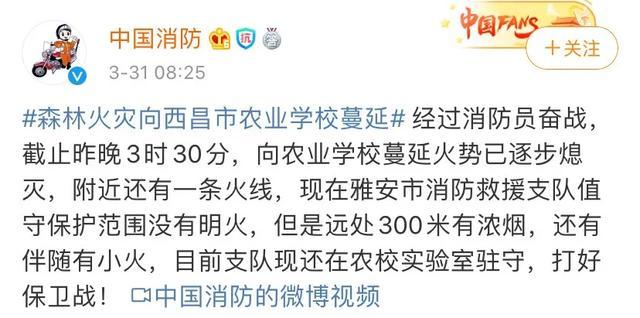 随后,@中国消防 最新消息:经过消防员奋战,截止昨晚3时30分,向农业学校蔓延火势已逐步熄灭,附近还有一条火线,现在雅安市消防救援支队值守保护范围没有明火,但是远处300米有浓烟,还有伴随有小火,目前支队现还在农校实验室驻守,打好保卫战!