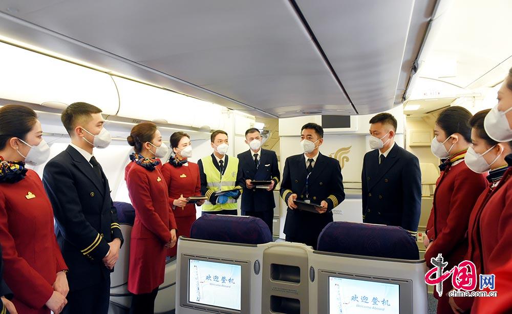 执行包机任务的机组和乘务组在调机去武汉前召开准备会。尹璐摄