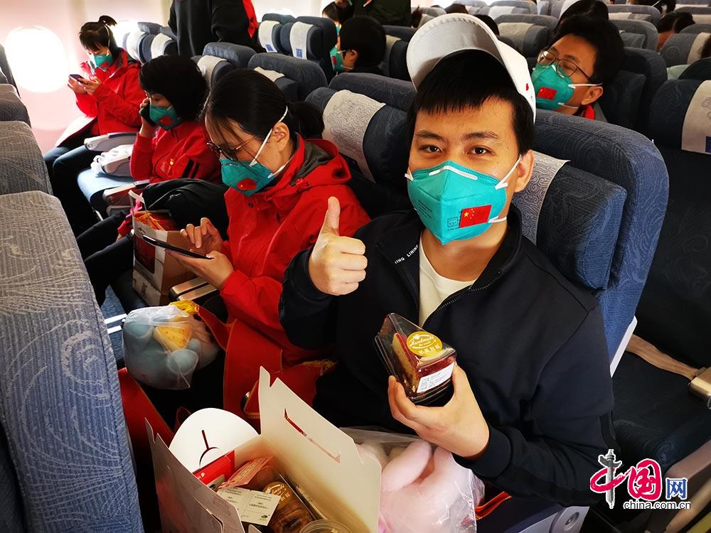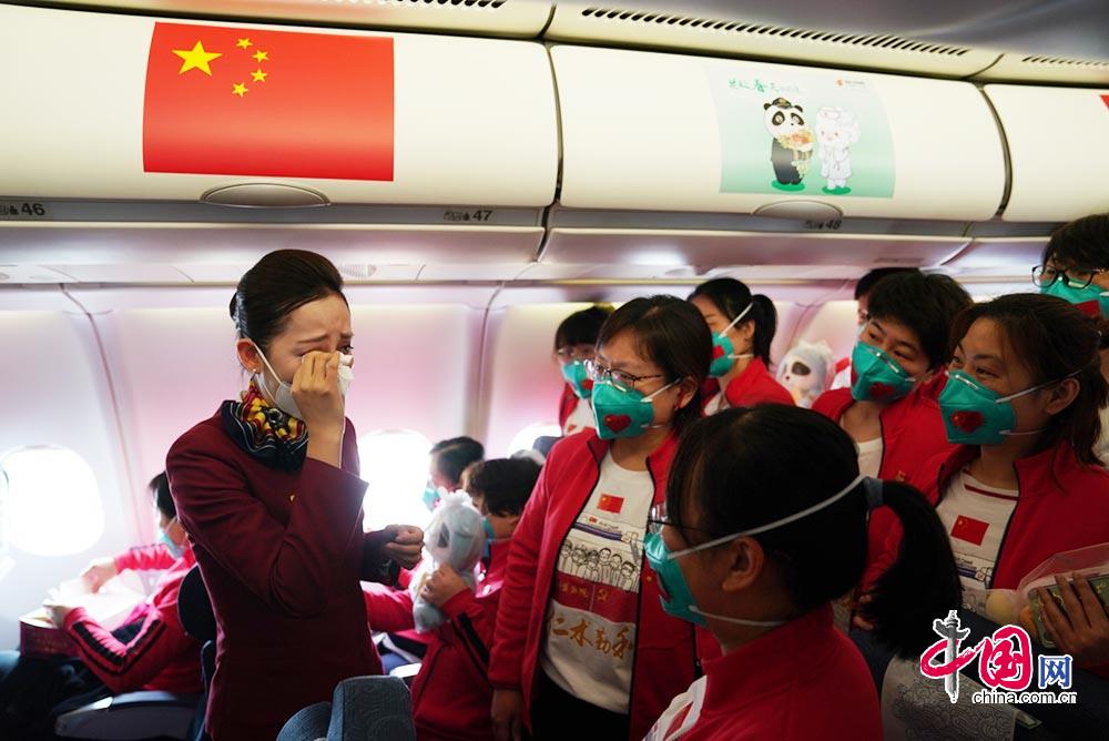 降落前乘务长广播响起:“亲爱的医疗队伙伴们,还有30分钟,我们这趟‘飞往春天的航班’就要降落在北京首都国际机场了,当舱门打开时,一定会有一幅春天的画卷展现在大家面前。虽然我们都将经历14天的隔离期,才能与亲人相见,但我们相信,无论何时何地,我们都将心意相通。‘因为我们是一家人,相亲相爱的一家人。’”