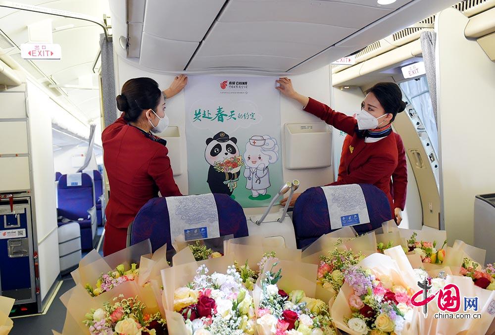 用一面面五星红旗和“共赴春天的约定”海报妆扮起来的客舱显得尤为亲切,让医疗队员们踏入客舱的那一刻就有了回家的氛围。“有多少分别是为了多少团聚,有多少盼望就有多少欣喜,昂首的凤凰闪耀着五星红旗,这是我心中最高的荣誉。”机组特意把国航司歌《心中的荣誉》作为登机音乐,致敬归来的英雄。