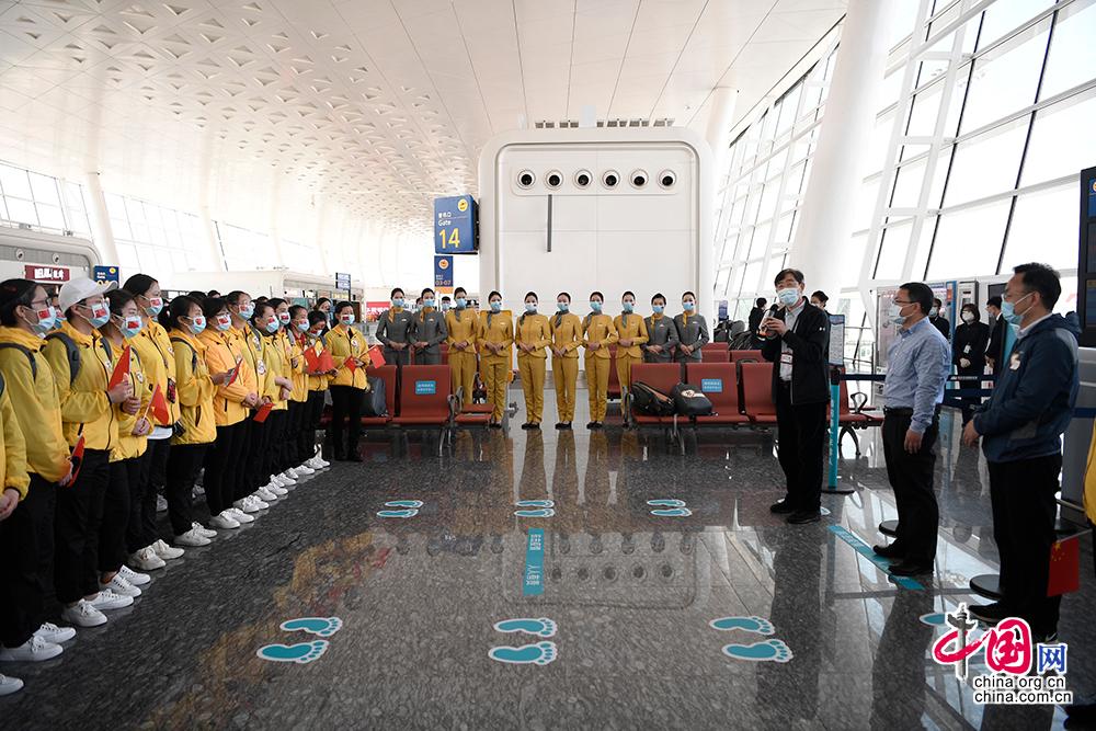 4月13日,江苏援湖北医疗队省人民医院队、国家紧急医学救援队(江苏)部分队员和江苏援武汉前线指挥部成员共205人撤离武汉。国家卫生健康委医管中心翟晓辉机场送行。中国卫生画报 陈浩摄