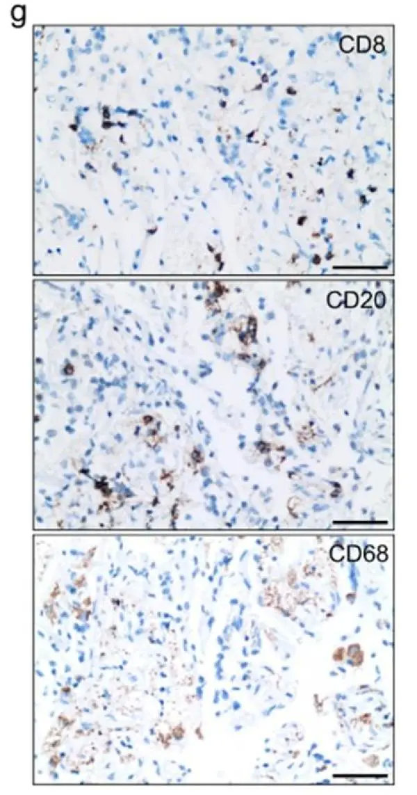肺组织中也存在与慢性呼吸系统疾病相关的变化。为了进一步描述肺泡间隙和隔中浸润免疫细胞的细胞类型,研究者进行了IHC染色,发现它们主要浸润CD68 +巨噬细胞,CD20 + B细胞和CD8 + T细胞。CD4 + T和CD38 +浆细胞几乎检测不到(数据未显示)。如下图所示: