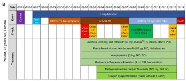 研究对象是一名78岁女性病人。她由于跌伤在2020年1月27日入院,该患者报告1月25日接触过新冠患者。自1月29日起,患者出现肺炎症状。在2月2日,采集鼻咽拭子并经过PCR检测后,患者确诊SARS-CoV-2阳性,并开始接受治疗。