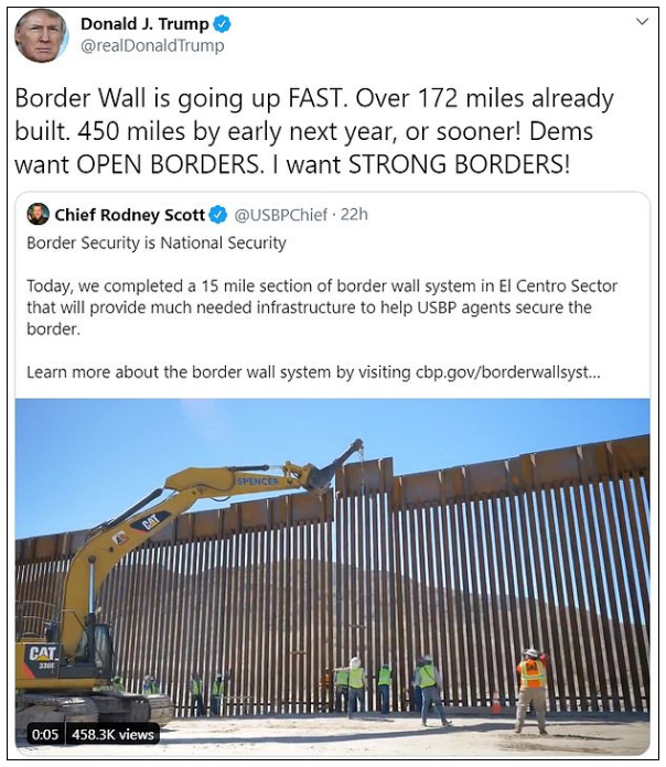 5月2日,特朗普曾在推特发文,报告建墙进度的“好消息”,表示自己想要“一堵坚实的墙”。