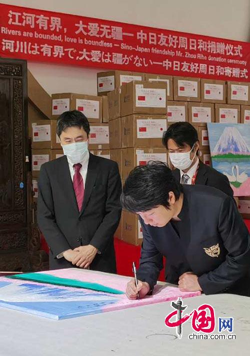 在捐赠仪式上,周日和在画作上题写了“江河有界,大爱无疆”八个字,赠送给日本驻华大使馆。