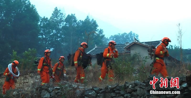 7日17时左右,凉山州喜德县与冕宁县交界处发生森林火灾,火场东线为主要发展方向,火场西风4至5级,地势陡峭,扑打难度大。 图为森林消防员赶赴火场。卢耀强 摄