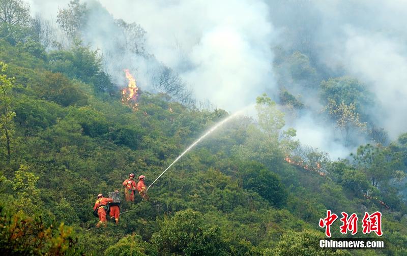 目前,四川省森林消防总队主要领导已带前指赶到火场一线靠前指挥,地方600余人配合森林消防展开灭火战斗。其中400人在喜德县境内的火场一线开设隔离带,火场扑打工作正在紧张进行。图为森林消防员正在通过水枪对火场扑打灭火。卢耀强 摄