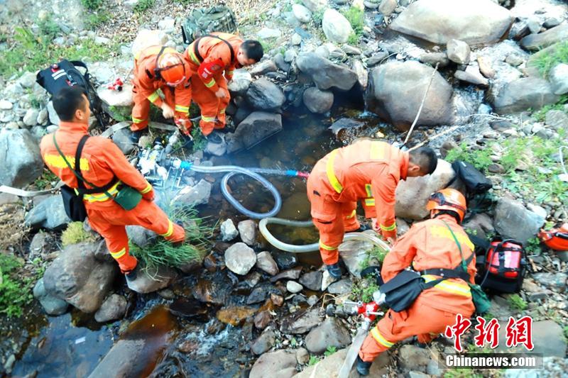森林消防员寻找水源和架设抽水泵。卢耀强 摄