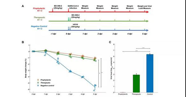 近日完成的中和抗体体内抗病毒实验已经证实,利用中国医学科学院医学实验动物研究所秦川教授团队的hACE2转基因小鼠模型,感染SARS-Cov-2后给予BD-368-2的治疗使病毒载量下降~2400倍。而注射BD-368-2后可完全抑制小鼠的病毒感染,达到预防效果。