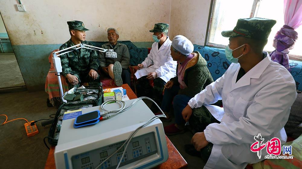 武警医疗分队携带医疗设备和药品走村入户义务巡诊。