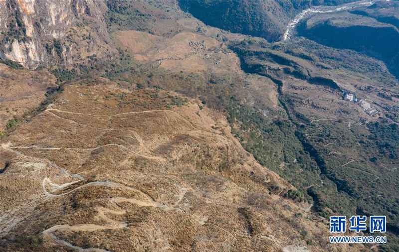 图为俯瞰通往阿布洛哈村的羊肠小道(2019年12月27日摄,无人机照片)。 新华社记者 江宏景 摄