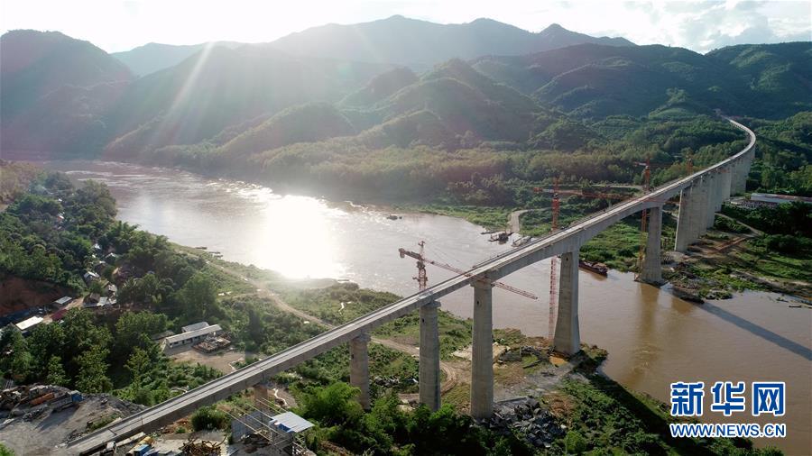 这是7月15日拍摄的中老铁路班纳汉湄公河特大桥(无人机照片)。 随着中老铁路班纳汉湄公河特大桥于日前完成架梁施工,中老铁路两座跨湄公河特大桥架梁施工任务全部完成,为中老铁路如期建成通车奠定坚实基础。 新华社发(中铁八局供图)