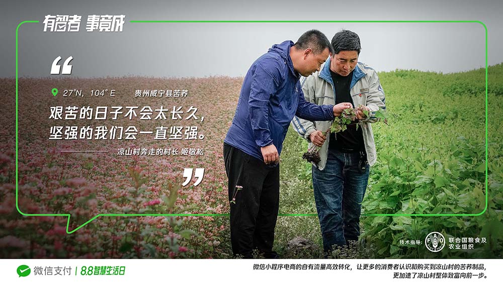 如今,凉山村苦荞正在被更多人认识、购买。而姬敬松并没有停下,依然穿梭在大片荞麦花海中,奔走在扶贫一线。据说最近,他又开始跟随新潮流,学习起了微信小程序直播,为威宁苦荞带货。