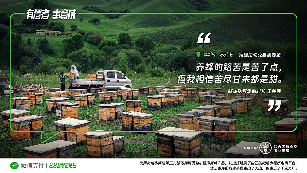 通过微信,越来越多的消费者知道了天山黑蜂,也认识了这位来自天山脚下的“女村长”。在微信小程序电商的支持下,尼勒克县的蜂农已达200余户,年产值达到了1.5亿元。