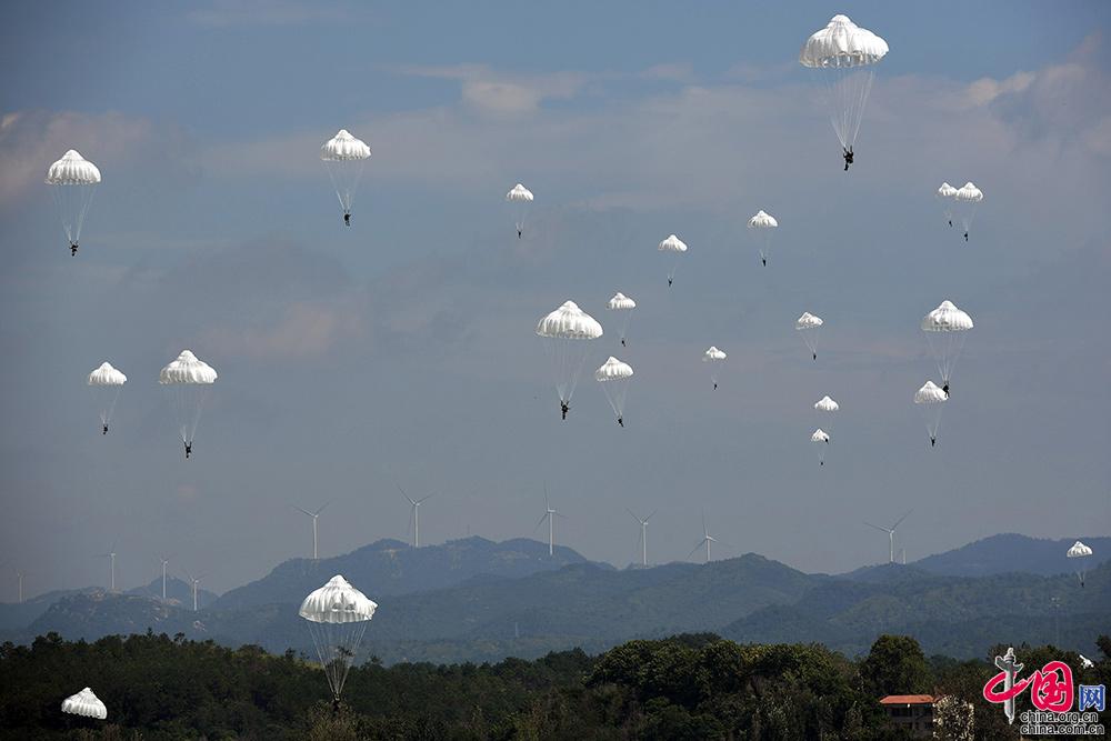 全副武装的学员实施集群伞降。余红春 摄