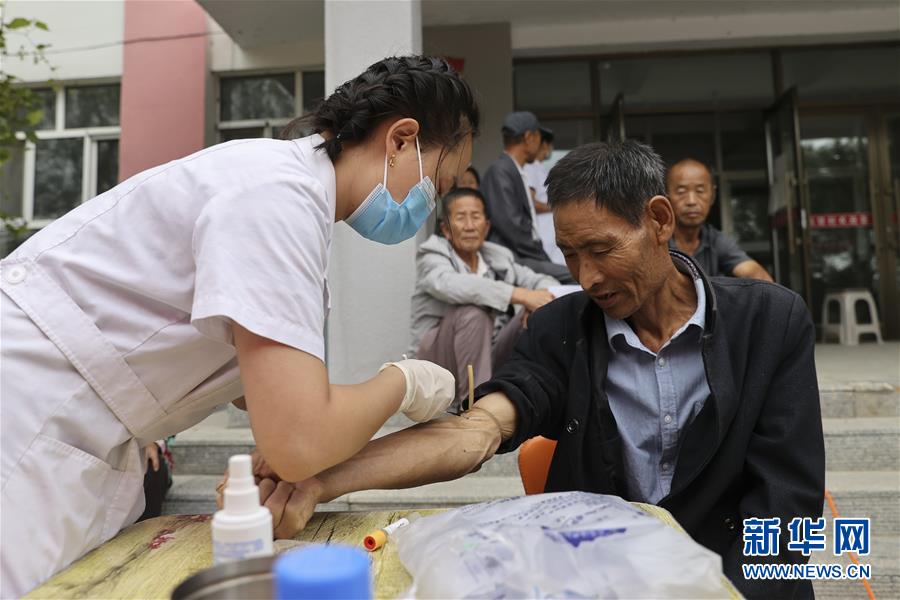 8月19日,在苏家店镇集贤村,驻村医疗队的医务人员为村民采血。 当日是第三个中国医师节,黑龙江省佳木斯市桦川县苏家店镇卫生院驻村医疗队的医务人员来到集贤村,为建档立卡贫困户和65岁以上老人进行义诊,给他们送去健康和温暖。 新华社发(张涛 摄)